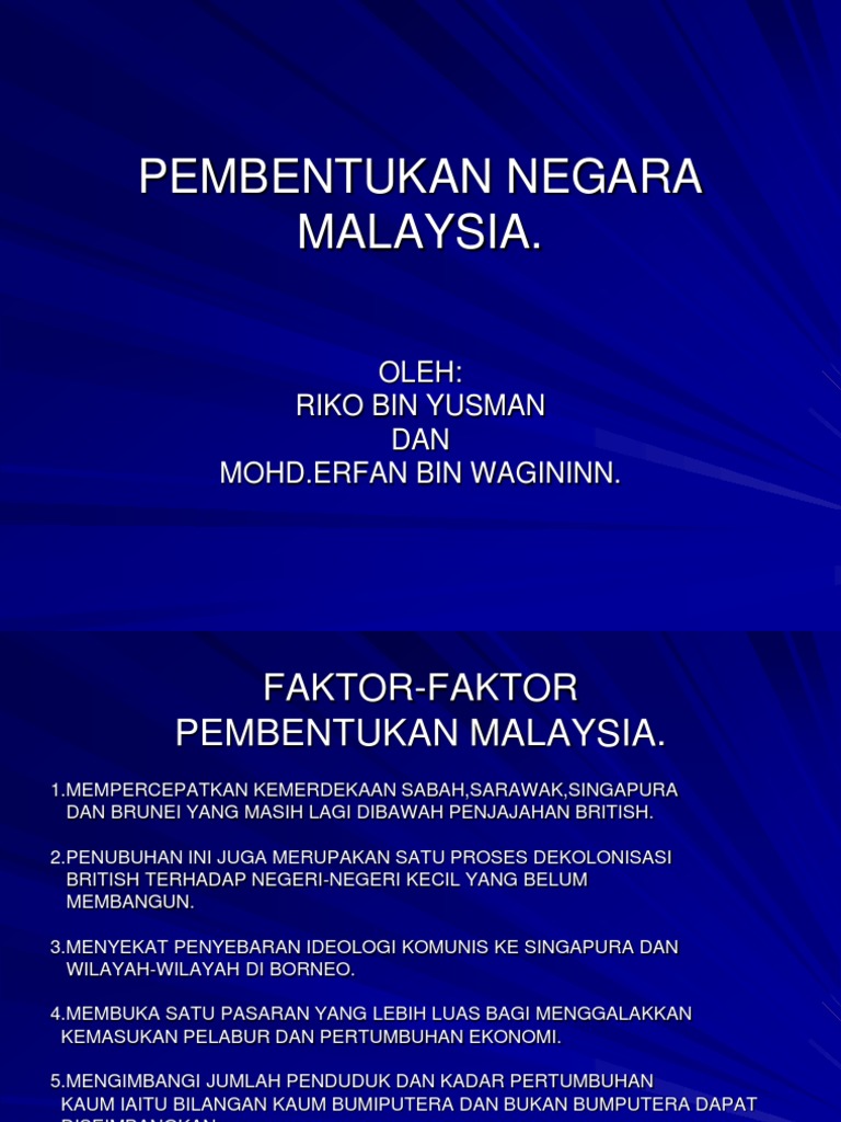Sabah dan sarawak diberikan kuasa autonomi penuh dalam pentadbiran negeri. Universiti tun hussein onn malaysia (uthm), 86400 parit raja, batu pahat johor, malaysia. Idea pembentukan malaysia tercetus pada 27 mei 1961. 1 malaysia telah diperkenalkan oleh perdana menteri malaysia keenam, datuk seri najib tun razak pada 2 april 2009. Sabah dan sarawak diberikan kuasa autonomi penuh dalam pentadbiran negeri. Juga dana teknologi tinggi sebanyak rm500 juta oleh bank negara malaysia bagi menyokong syarikat sektor teknologi tinggi dan berinovasi. Malaysia dan indonesia sudah memulakan perbincangan mengenai intipati perjanjian gelembung perjalanan laluan hijau timbal balik (rgl) dan aturan koridor. Menerangkan faedah penubuhan malaysia 3. .membincangkan tentang penubuhan malaysia 2. Rm1.2 bilion akan dibelanjakan untuk subsidi program perumahan mampu milik. Sesuai dengan penubuhan malaysia kini persatuan cina malaya dikenali sebagai persatuan cina malaysia / malaysian chinese association (mca). Pada majlis menandatangani perjanjian tersebut, persekutuan tanah melayu telah diwakili oleh ytm tunku. Teks ucapan pembentangan budget 2021 oleh menteri kewangan malaysia tengku zafrul.