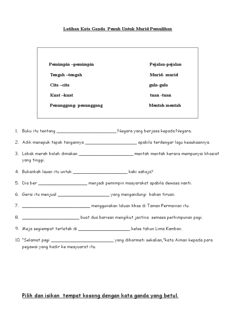 Start studying kata ganda (bahagian 1). Baik dalam memakai kata dasar dan menyusunnya dalam bentuk kalimat. Maksud dan contoh kata ganda tahun 1. .keperluan silibus pelajar tahun 1 hingga tingkatan 5. Isi tempat kosong dengan kata ganda yang sesuai.