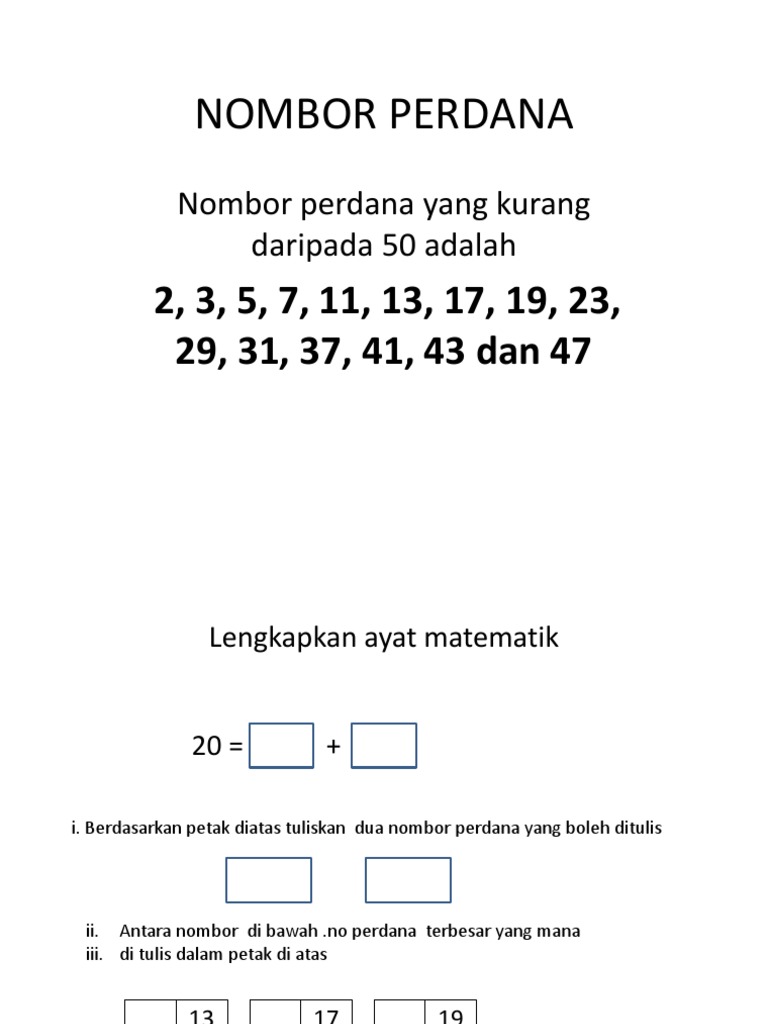 Nombor Perdana Tahun 6 from image.slidesharecdn.com Kita sering merujuk kepada penggunaan nombor prima dalam kriptografi, tetapi mereka terlalu besar untuk menjadi sangat. Tip dari kanda, kalo lagi mau berangkat di rumah temen lawan jenis, mending sempetin beli minuman di luar. Menentukan nombor perdana yang kurang daripada 100. Nombor perdana (prime number) adalah nombor bulat yang hanya boleh dibahagikan dengan dirinya sendiri dan nombor 1 (the number itself and number 1). Kenal pasti nombor perdana (tahun 6). Nombor perdana (prime number) adalah nombor bulat yang hanya boleh dibahagikan dengan dirinya sendiri dan nombor 1 (the number itself and number 1). Nombor perdana yang kurang daripada 50 adalah 2, 3, 5, 7, 11, 13, 17, 19, 23, 29, 31, 37, 41, 43 dan 47. Sebenarnya senang je nak kenal nombor perdana nombor perdana hanya boleh dibahagi di dalam video ini: