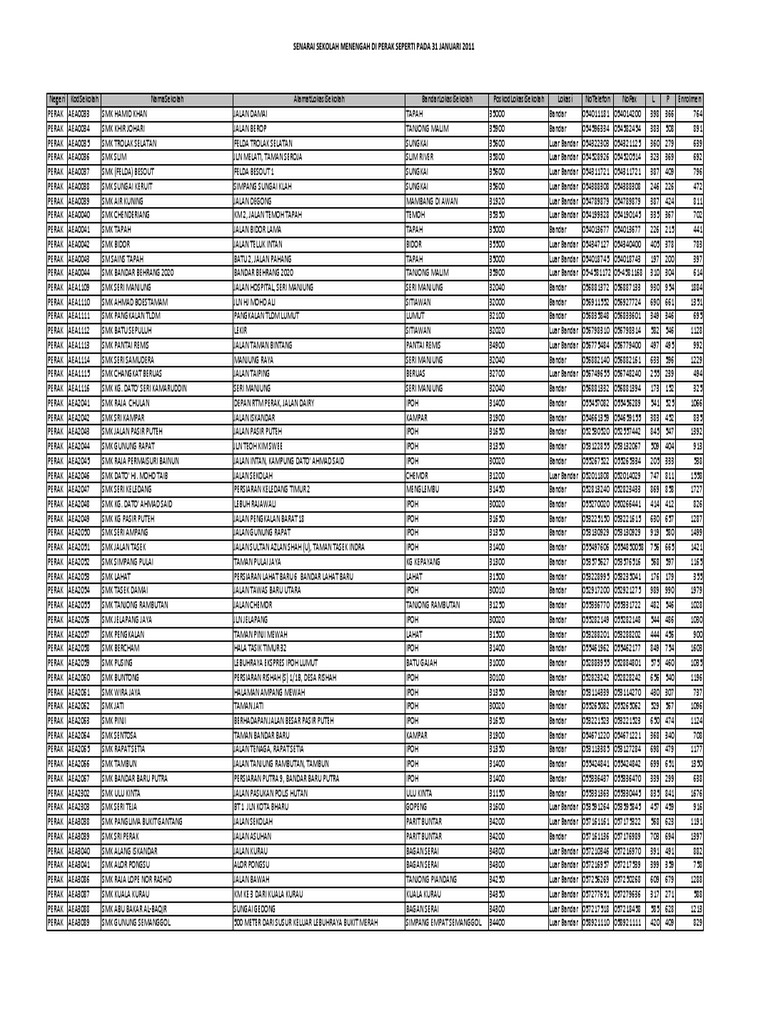 Save save senarai sekolah rendah di perak for later. Sekolah kebangsaan sungai galah kampong sungai galah jalan tanjong tualang 31800 tanjung tualang perak nombor telefon. Senarai sekolah rendah di perak. Pada 14 januari 1957 sekolah ini telah ditubuhkan di tapak kem tentera darat di baeza avenue kini dikenali dengan jalan hospital dan asalnya dikenali dengan sekolah menengah melayu. Save save senarai sekolah rendah di perak for later. Pelaksanaan penambahbaikan program rancangan makanan tambahan (rmt) tahun 2020. Spreadsheet senarai sekolah rendah dan menengah 31 mei 2019 xlsx. Akaun amanah tabung penyelenggaraan sekolah kerajaan dan ipta. For more information and source, see on this link : Senarai sekolah rendah di perak. Senarai sekolah menengah di perak. 1) sekolah jenis kebangsaan (cina) chung hwa jalan belanja 32800 parit perak nombor telefon : This is a list of schools in perak malaysia.
